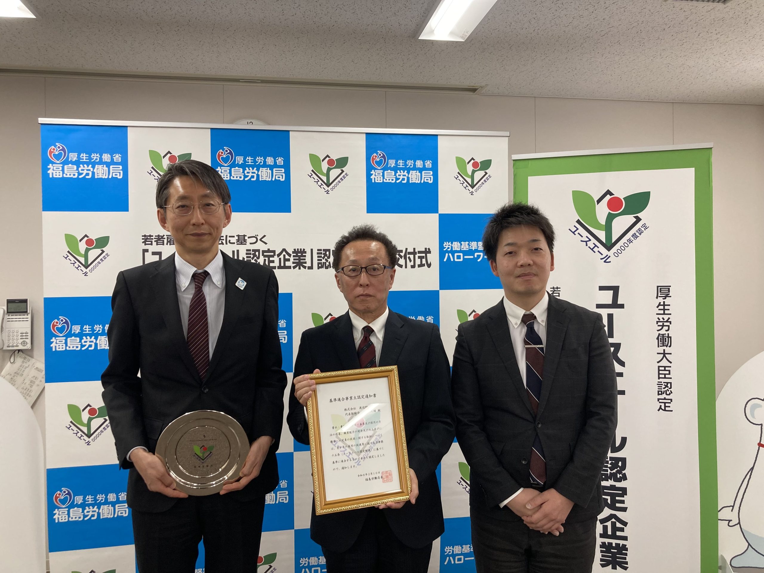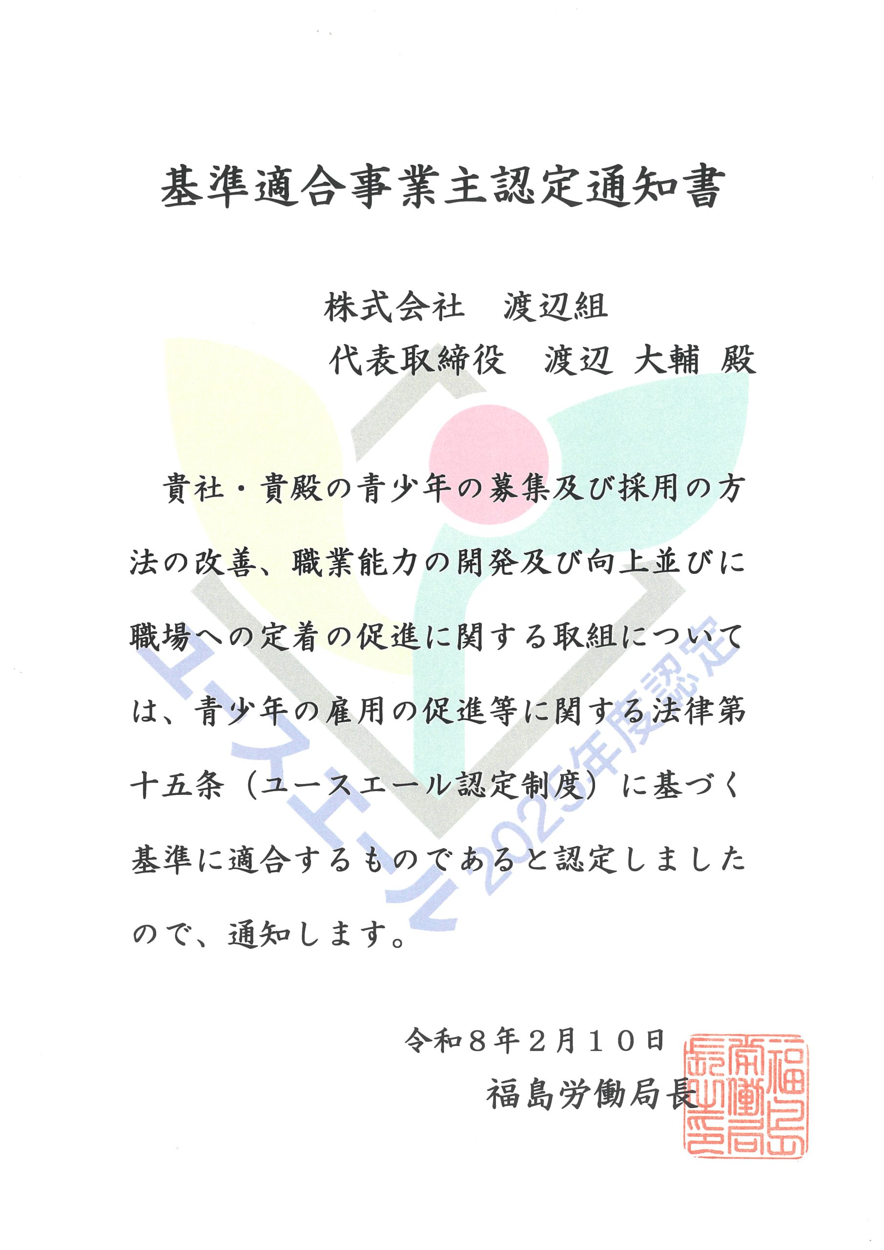 令和8年2月10日、株式会社渡辺組は厚生労働省より「ユースエール認定企業」として認定されました。